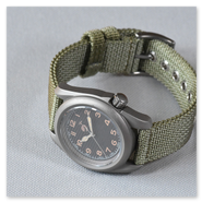 Classic vintage field watch, screw-down case back, screw-down crown offset to 3.8 o'clock position. Nylon strap. Vintage field or pilots dial with luminescent indices and green luminous hands (made with environmentally friendly inactive luminous material).