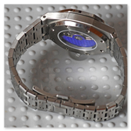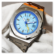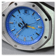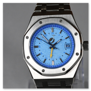 „Royal Oak“ Homage in blue. “Royal Oak” was a legendary wristwatch from the luxury watch manufacturer Audemars Piquet in the 1980s. Here I am showing a freely modified design in the classic case, but with a completely different dial and hands. Stainless steel case with sapphire crystal (very hard - almost unscratchable), dial with textured surface and 24-hour scale, yellow hands for the second time zone (GMT) and minute and hour hands that glow green in the dark. Strap with butterfly clasp.