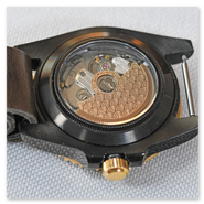 Elegant, sporty automatic watch in a water-resistant stainless steel case (tested to 6 bar) with sapphire crystal (hardened - scratch-resistant). Rotating bezel (120 clicks), screw-down exhibition back, screw-down crown, black genuine leather strap, central second hand, black carbon dial with day of the week (English) and date display. Luminescent hands in green (environmentally friendly inactive luminous material).
