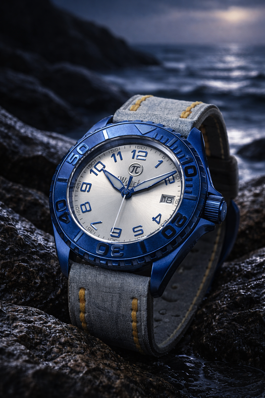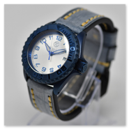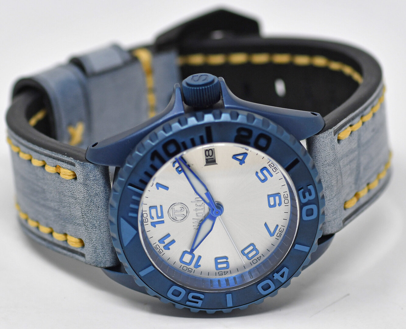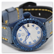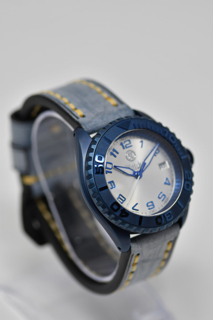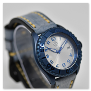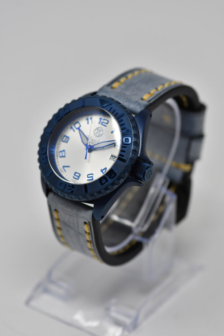 Sporty and elegant wristwatch in matt blue. Silver dial with blue numerals and blue and white hands round of the design. The crown can be screwed down and the lid has a viewing window. The leather strap is made of high quality leather and the colour underlines the design of the watch.
