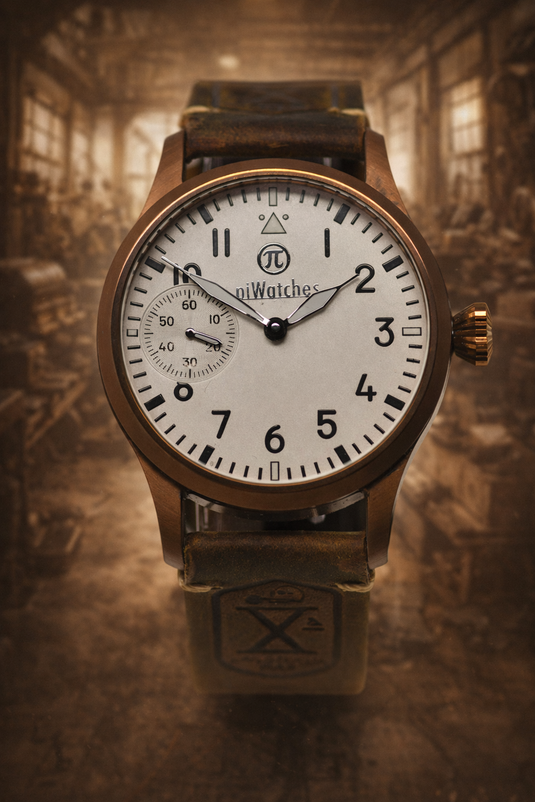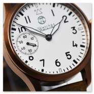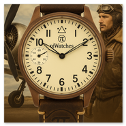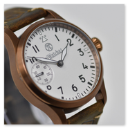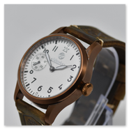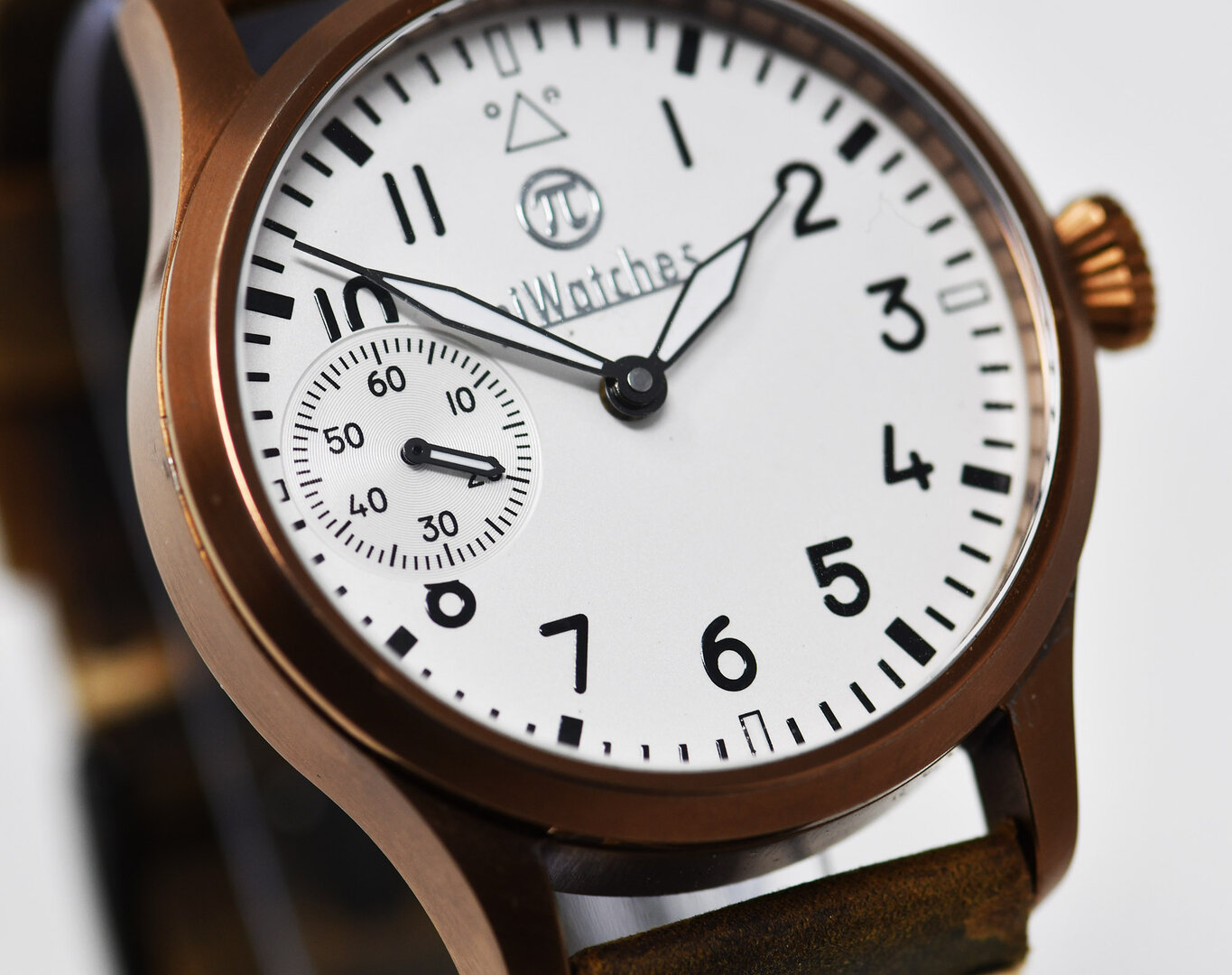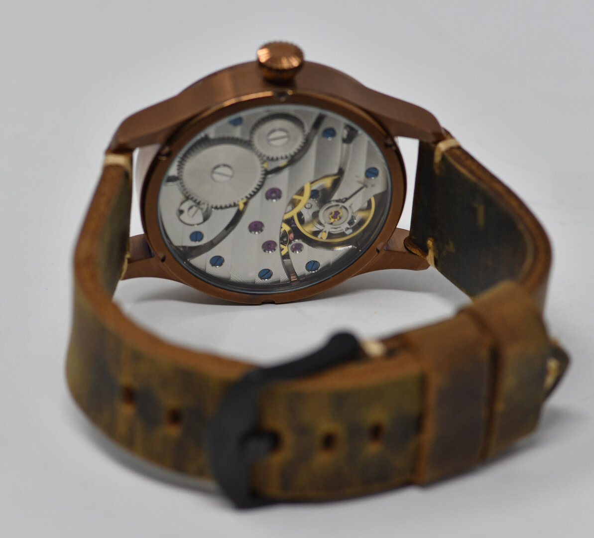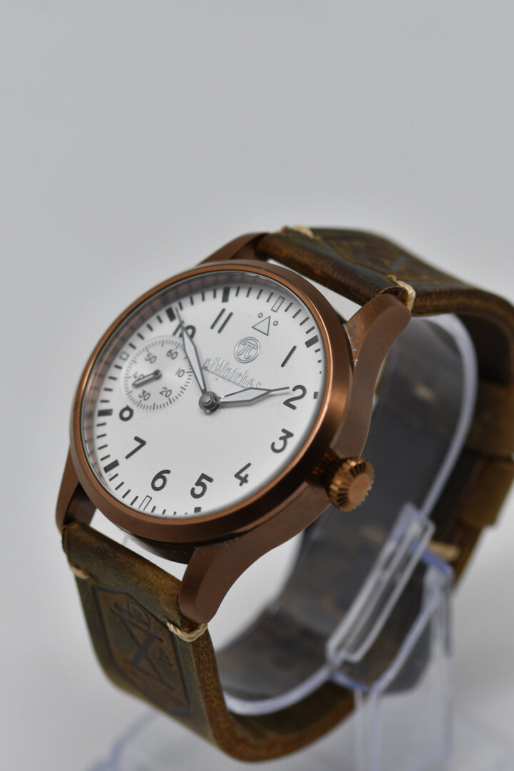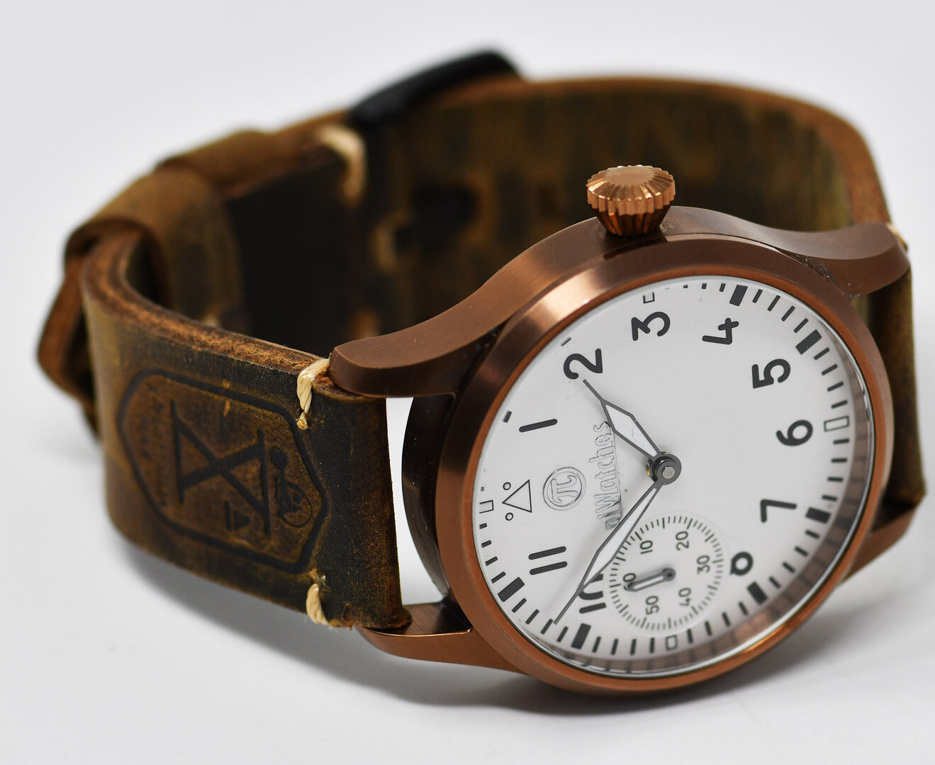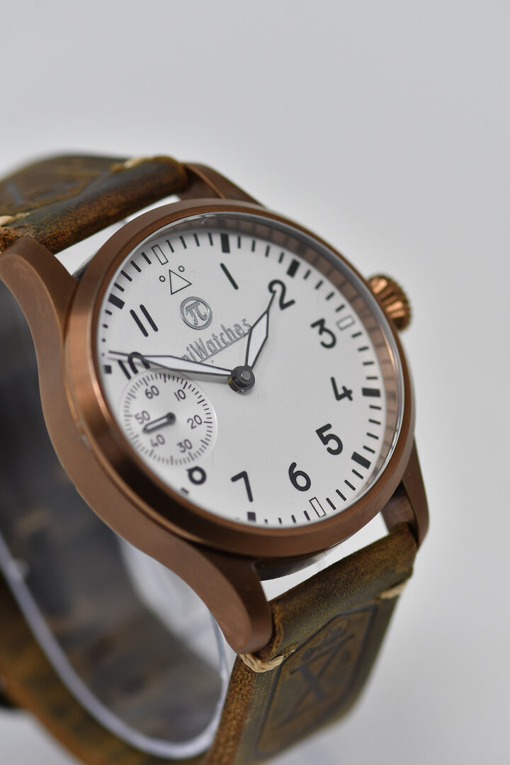 This is my first watch with the ST3601 movement from the factory in Hong Kong. I am very satisfied with the movement. It is very easy to adjust and seems to be very robust. A great, very simple but sophisticated design. The watch runs perfectly and is just like it used to be – you have to wind it every day. Really great! The watch has a typical pilot watch style. The bronze case goes well with the wide brown leather strap. A watch for men with stronger arms.