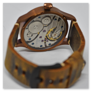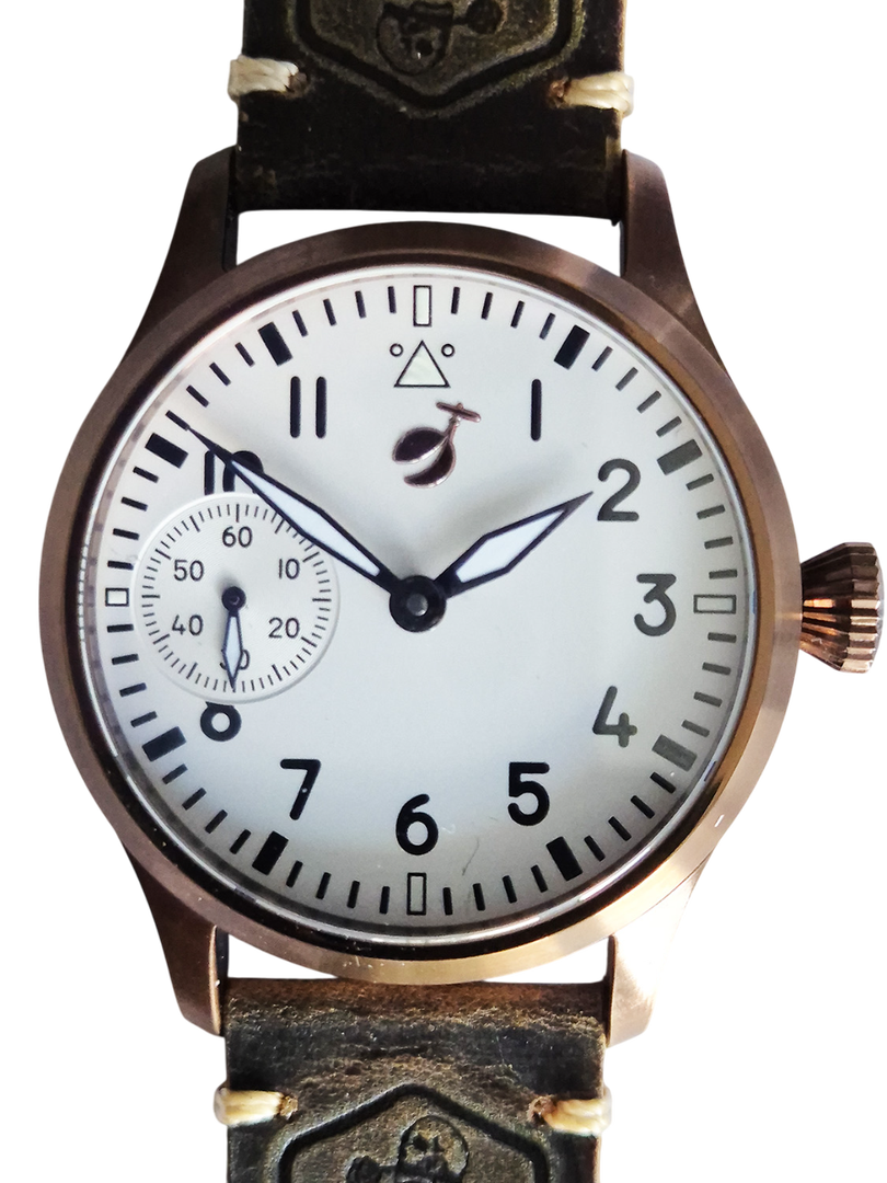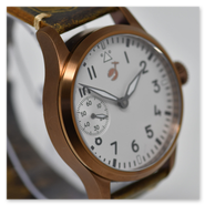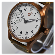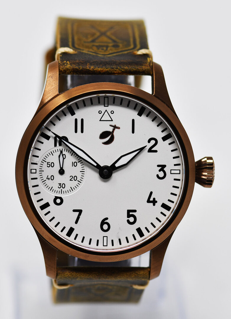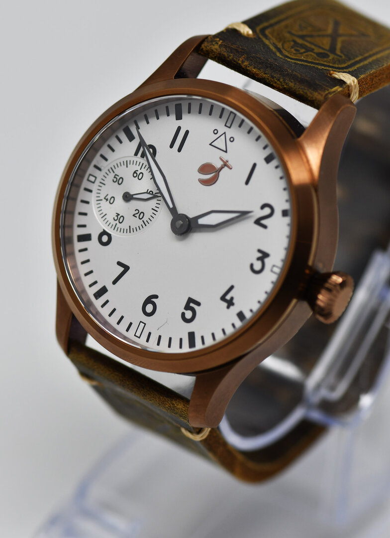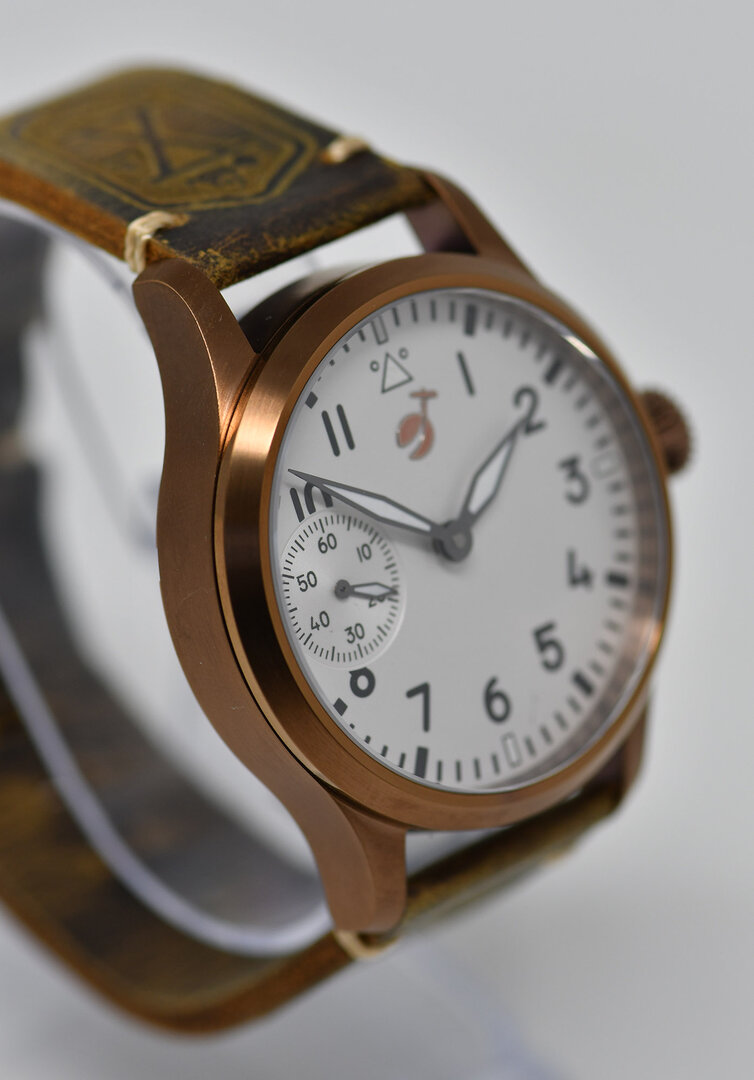 This is watch with the ST3601 movement from the factory in Hong Kong. I am very satisfied with the movement. It is very easy to adjust and seems to be very robust. A great, very simple but sophisticated design. The watch runs perfectly and is just like it used to be – you have to wind it every day. Really great! The watch has a typical pilot watch style. The bronze case goes well with the wide brown leather strap. A watch for men with stronger arms.