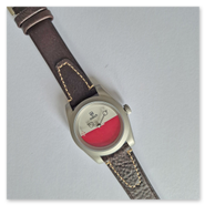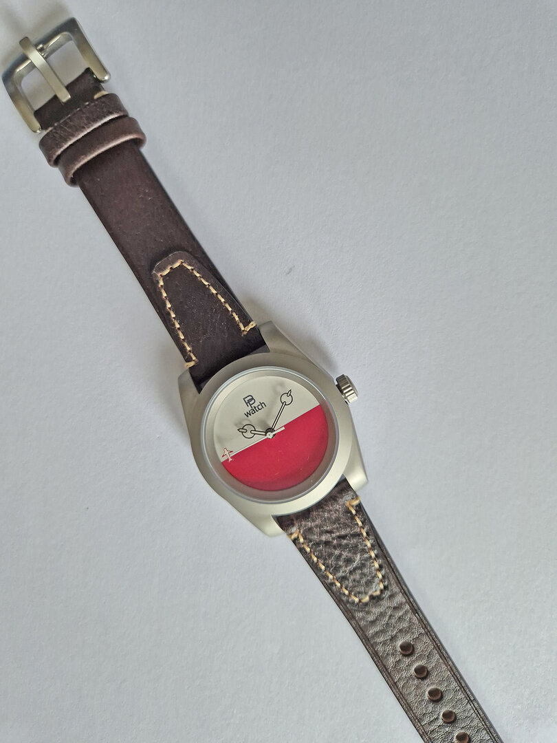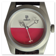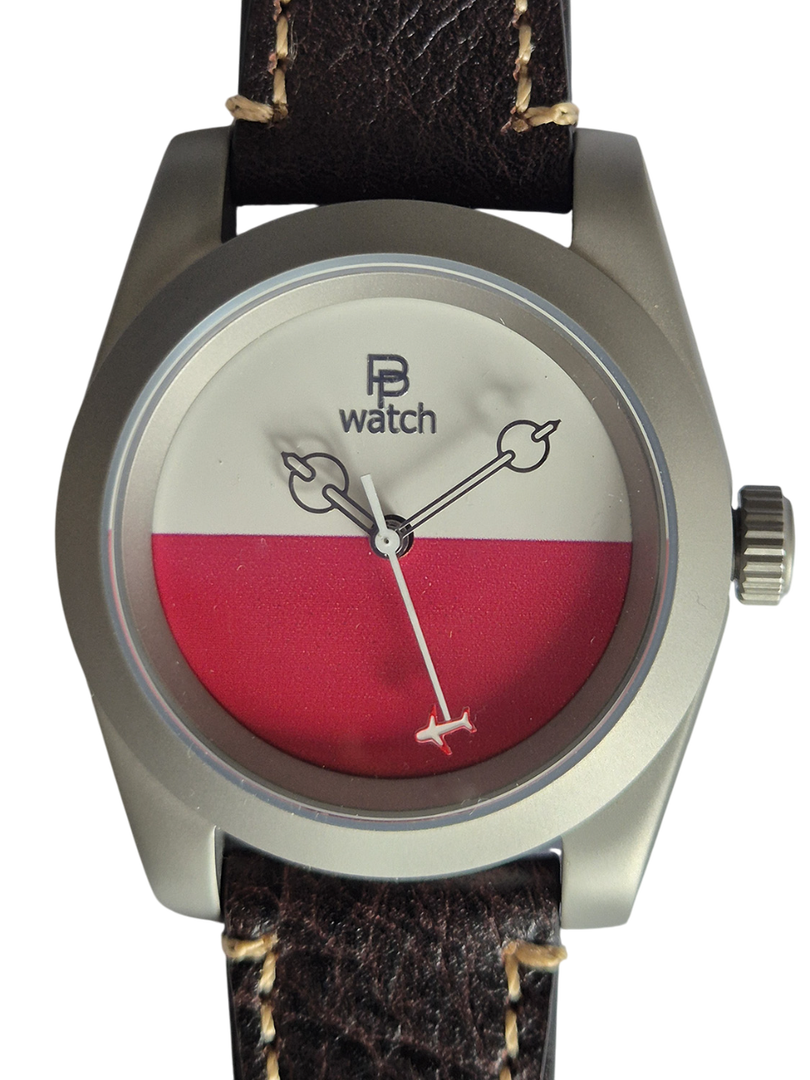 "Patriotic" wristwatch in the Polish national colours. Minimalist design with delicate hands and a seconds hand featuring a red and white silhouette of an aeroplane. The sandblasted stainless steel case emphasises the simplicity of the design. Elegant and sporty at the same time.