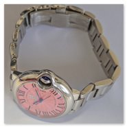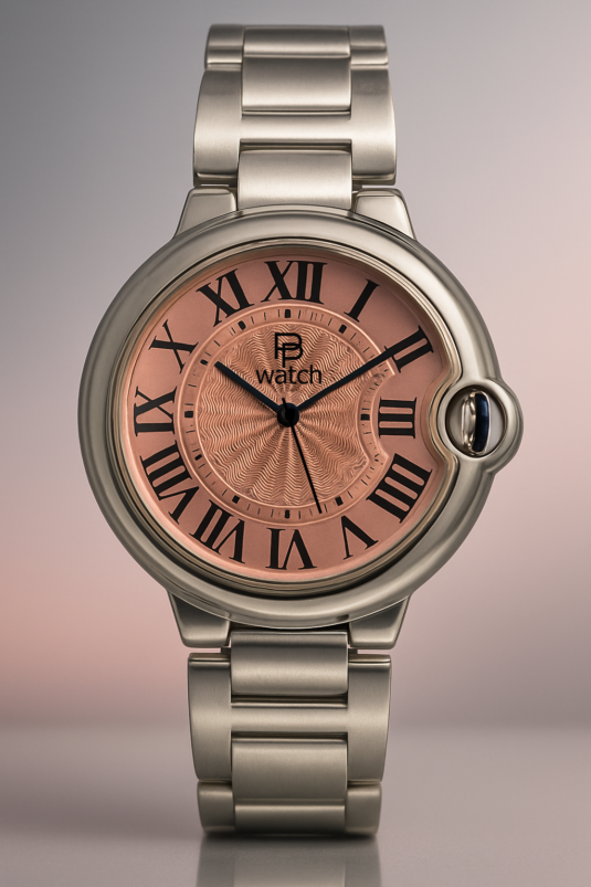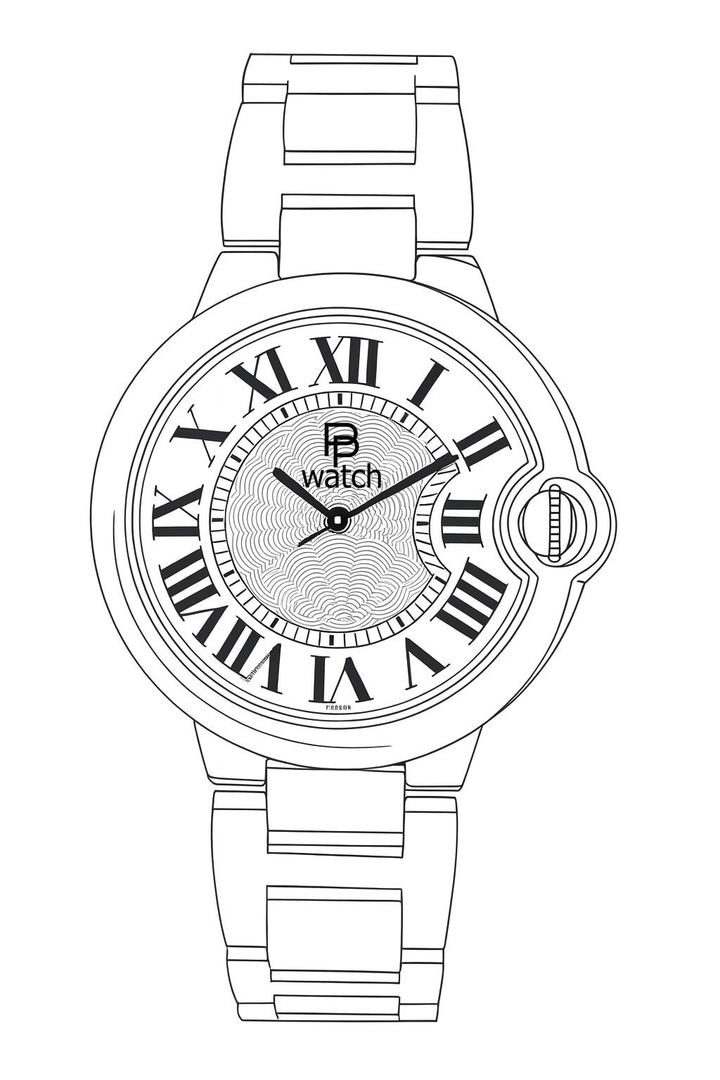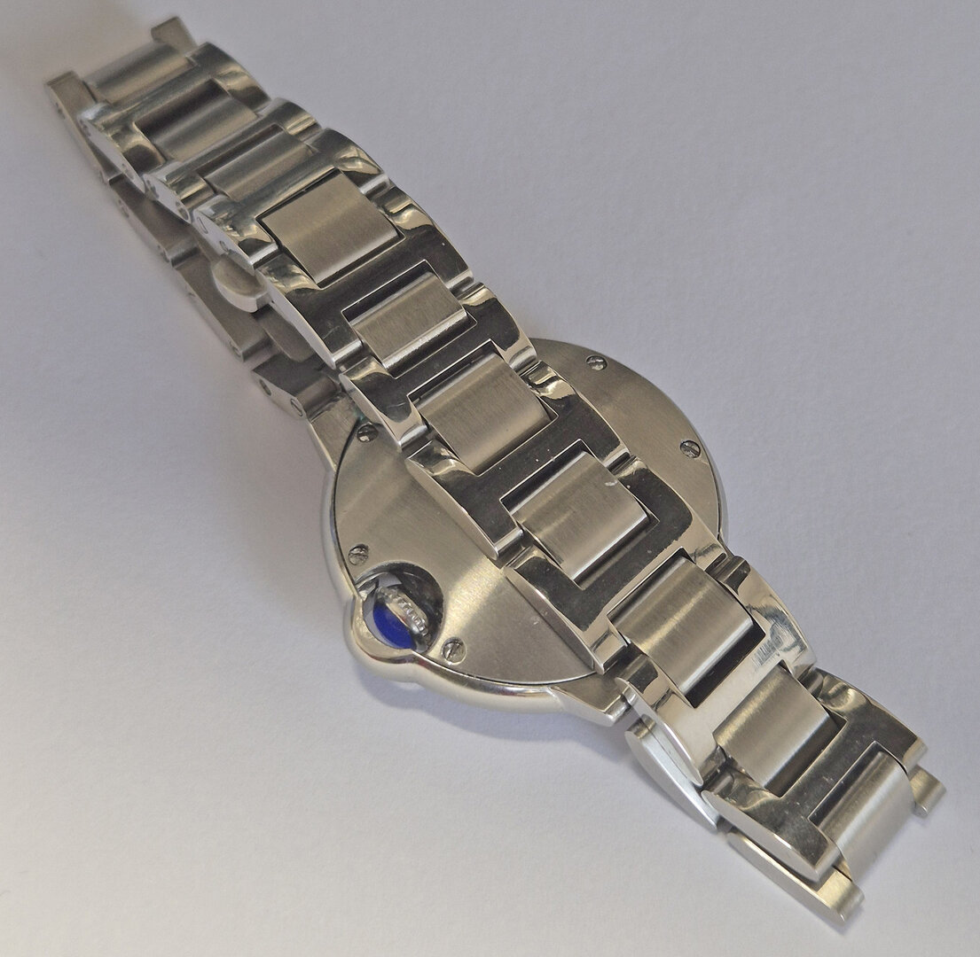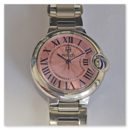 The smallest of the three watches in the series. It is modelled on the "Cartier-Ballon-Bleu" style and powered by the small Seiko NH05 movement. It is somewhat awkward to assemble the case due to the crown hidden by the surrounding case part.