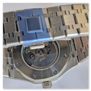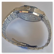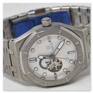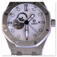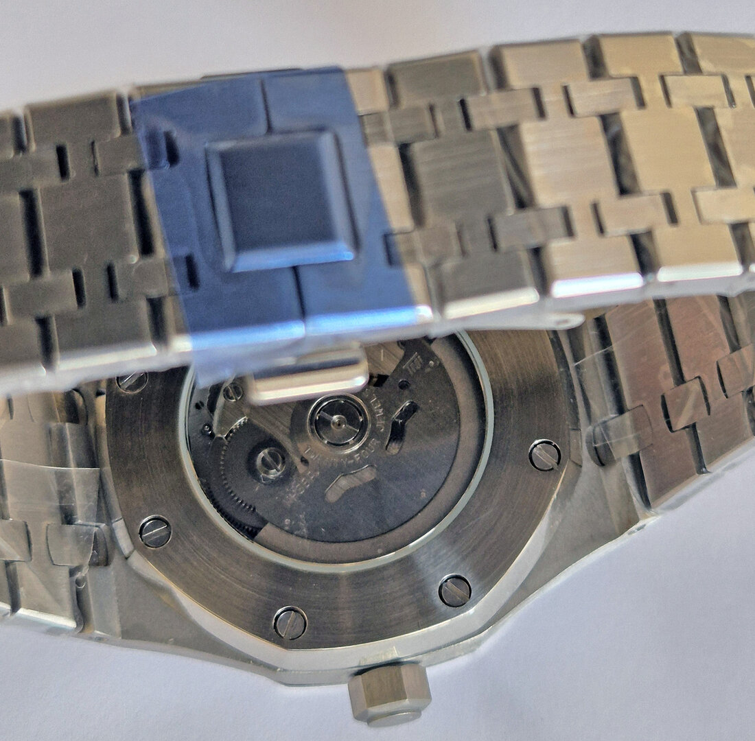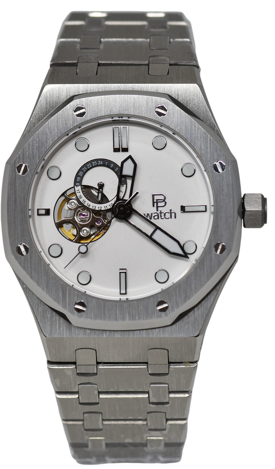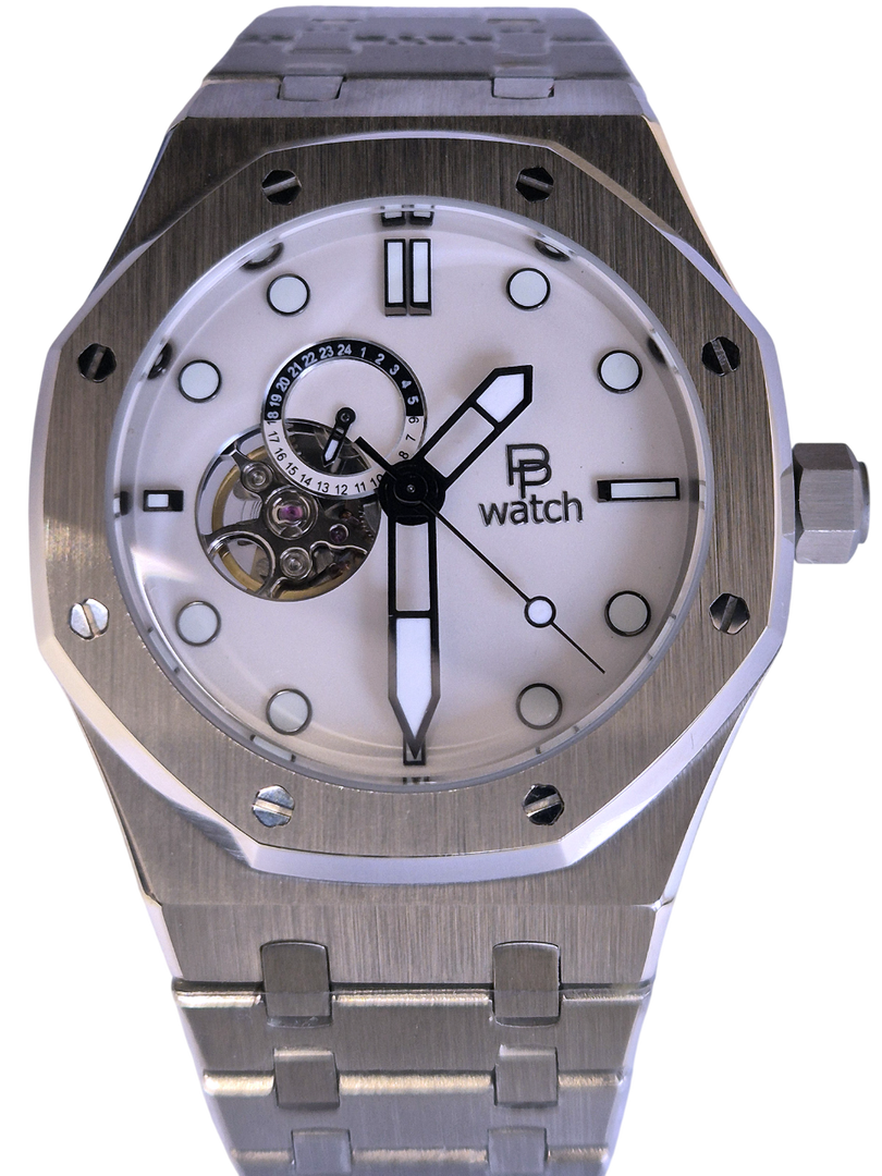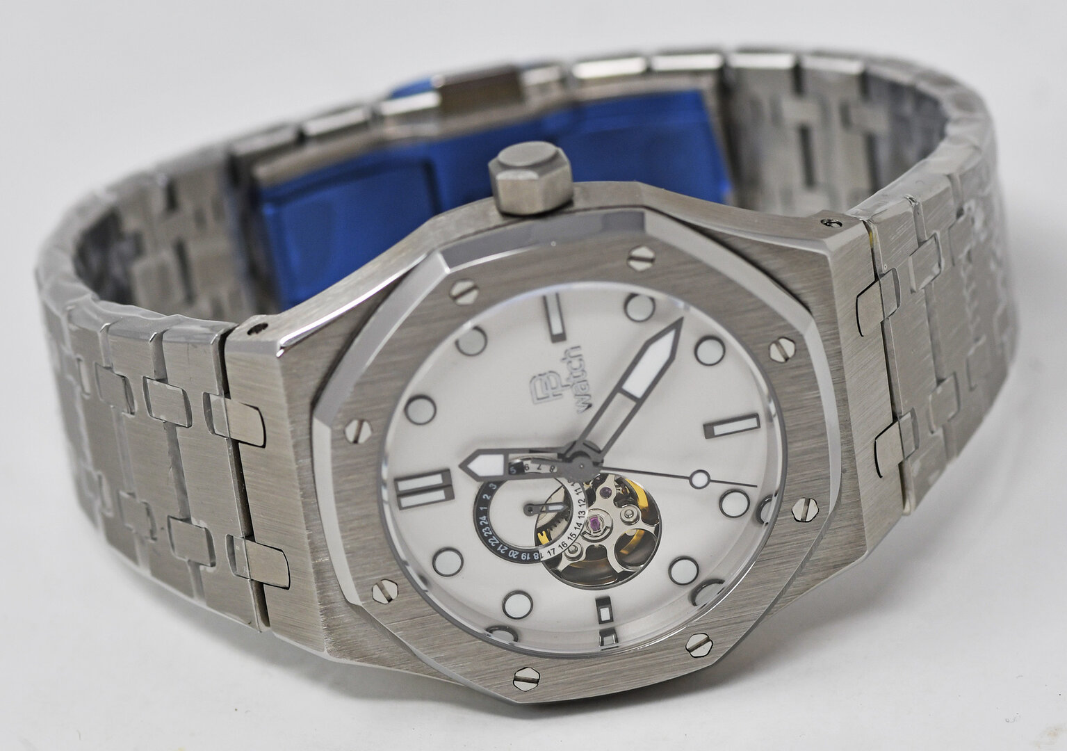 This mechanical automatic watch combines iconic design with proven watchmaking reliability. The distinctive octagonal stainless steel case with visible screws reflects the spirit of classic luxury sports watches with an integrated case design, giving the timepiece a strong, technical presence on the wrist.