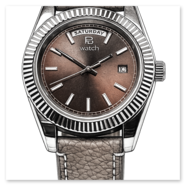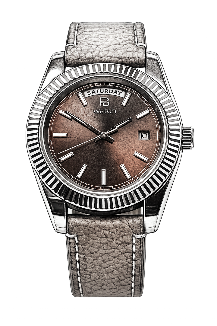The reduced dial design with applied indices ensures excellent legibility and timeless elegance. The day-date layout is inspired by traditional mechanical wristwatches of the 1960s and 1970s, lending the watch a subtle vintage character.