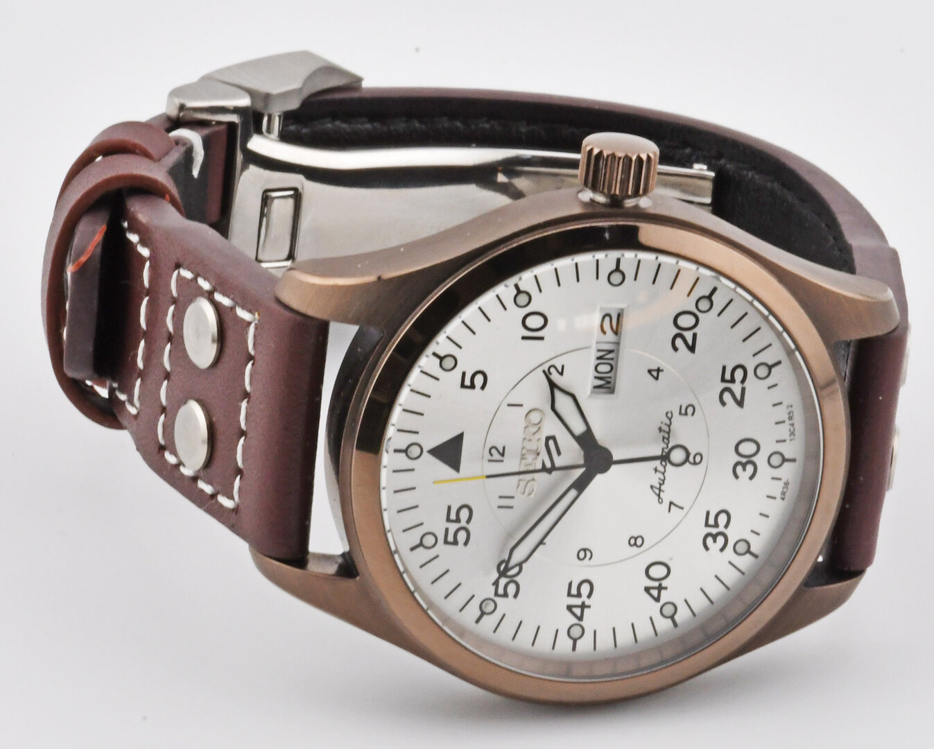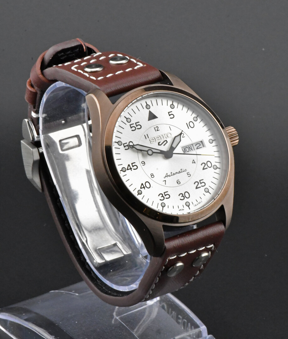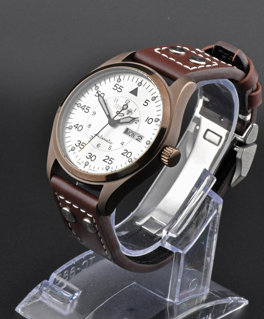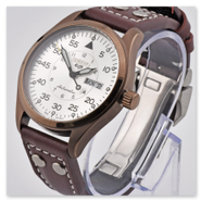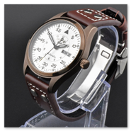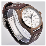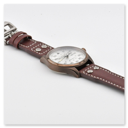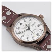 The finely brushed silver pilot-style dial reflects clarity and balance, enhanced by applied indices and carefully proportioned hands that ensure excellent legibility at a glance. Encased in a well-balanced stainless steel housing and paired with a classic pilot-style leather strap, this timepiece blends functional precision with understated elegance.